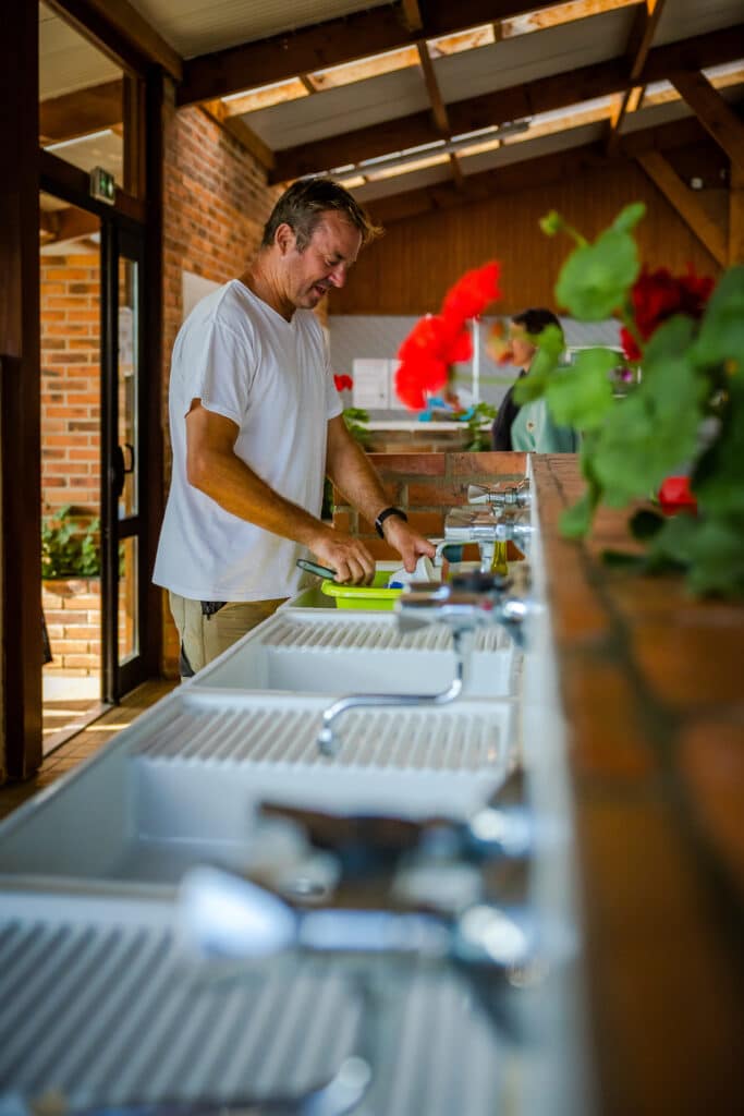Onze verwarmde sanitaire voorzieningen zijn ontworpen om te voldoen aan de behoeften van het hele gezin, in een schone, moderne en gastvrije omgeving. Je vindt er ook babycabines om de zorg voor de kleintjes te vergemakkelijken, een PBM-cabine voor gemakkelijke en veilige toegang en een wasruimte met wasmachine, wasdroger en strijkplank.